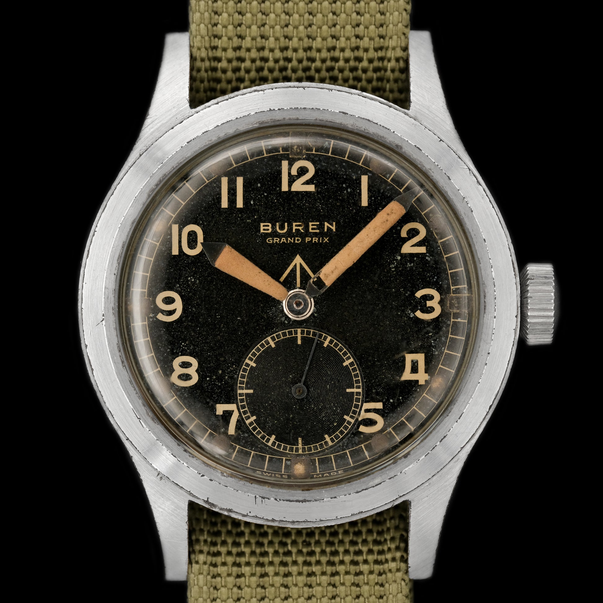 During World War II, the British Ministry of Defence commissioned twelve Swiss watchmakers to produce robust field timepieces for military use. The result was the legendary “Dirty Dozen” — twelve brands each delivering watches between 1944 and 1945 that met strict specifications: black dials with Arabic numerals, small seconds at 6 o’clock, luminous hands and markers, railroad-style minute tracks, hand-wound 15-jewel movements, water/shock resistance, and the “W.W.W.” caseback stamp plus the Broad Arrow emblem. The Buren Grand Prix (with its Caliber 462 movement) stands out among Dirty Dozen examples thanks to its in-house movement and design integrity. While many Dirty Dozen watches used outsourced or shared calibers, Buren built its own “Grand Prix” movement, giving it a technical edge. Because fewer Buren units were made (about 11,000) compared to some others, well-preserved pieces are rarer, making the Grand Prix more desirable for those seeking originality and quality.