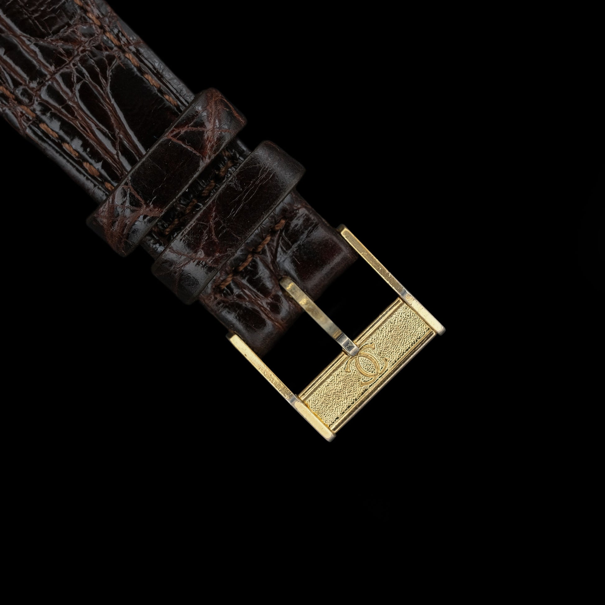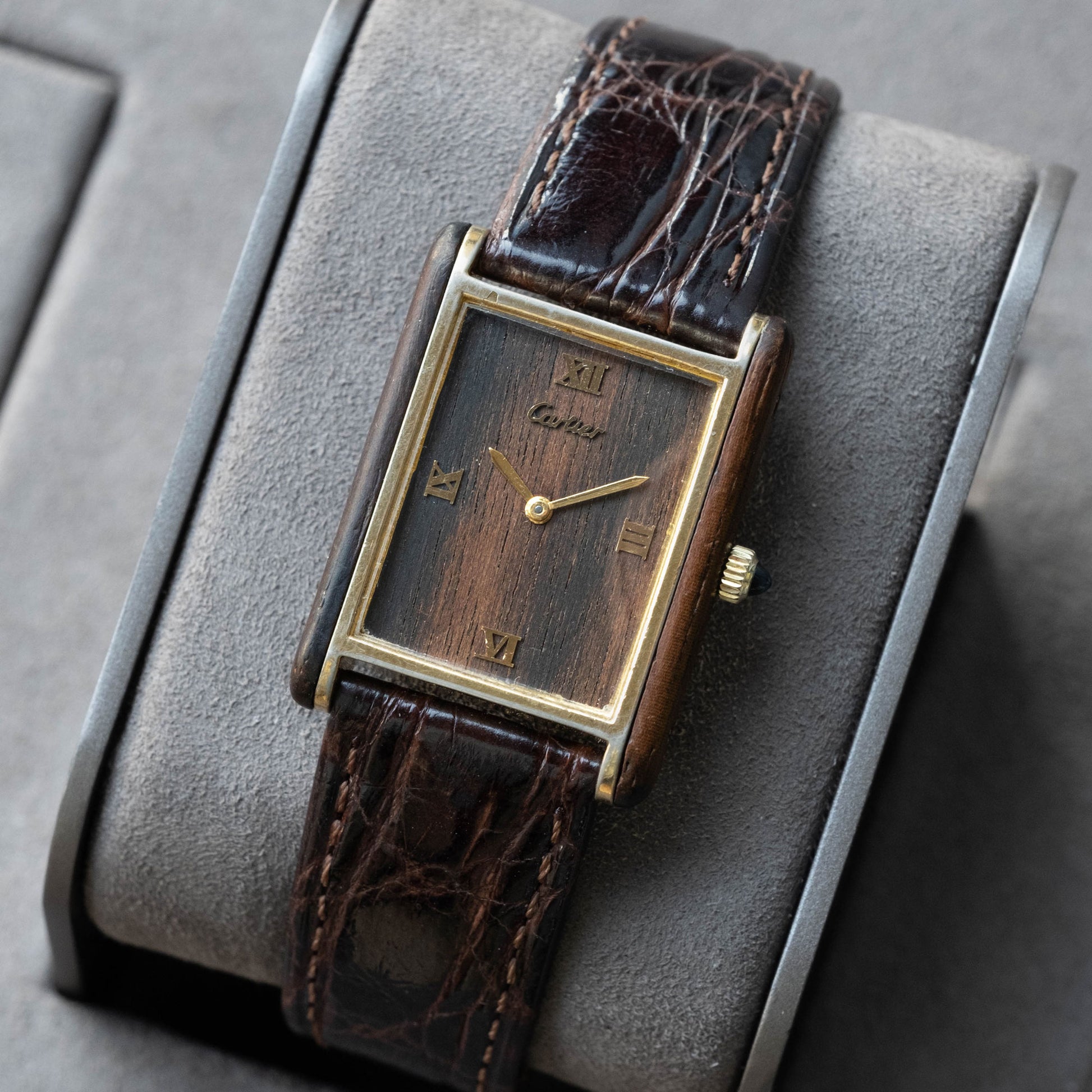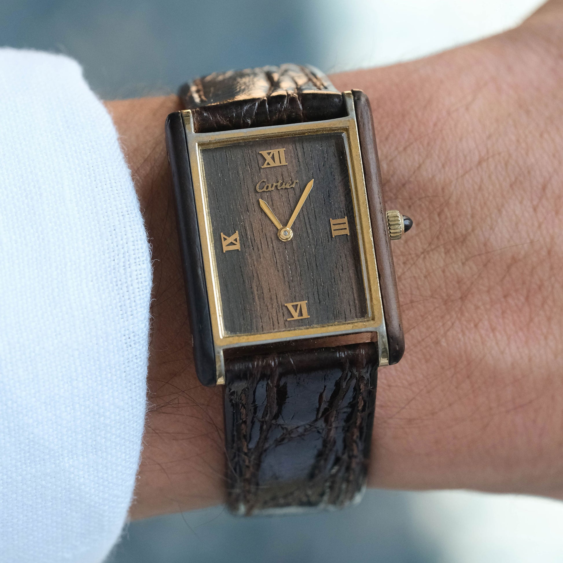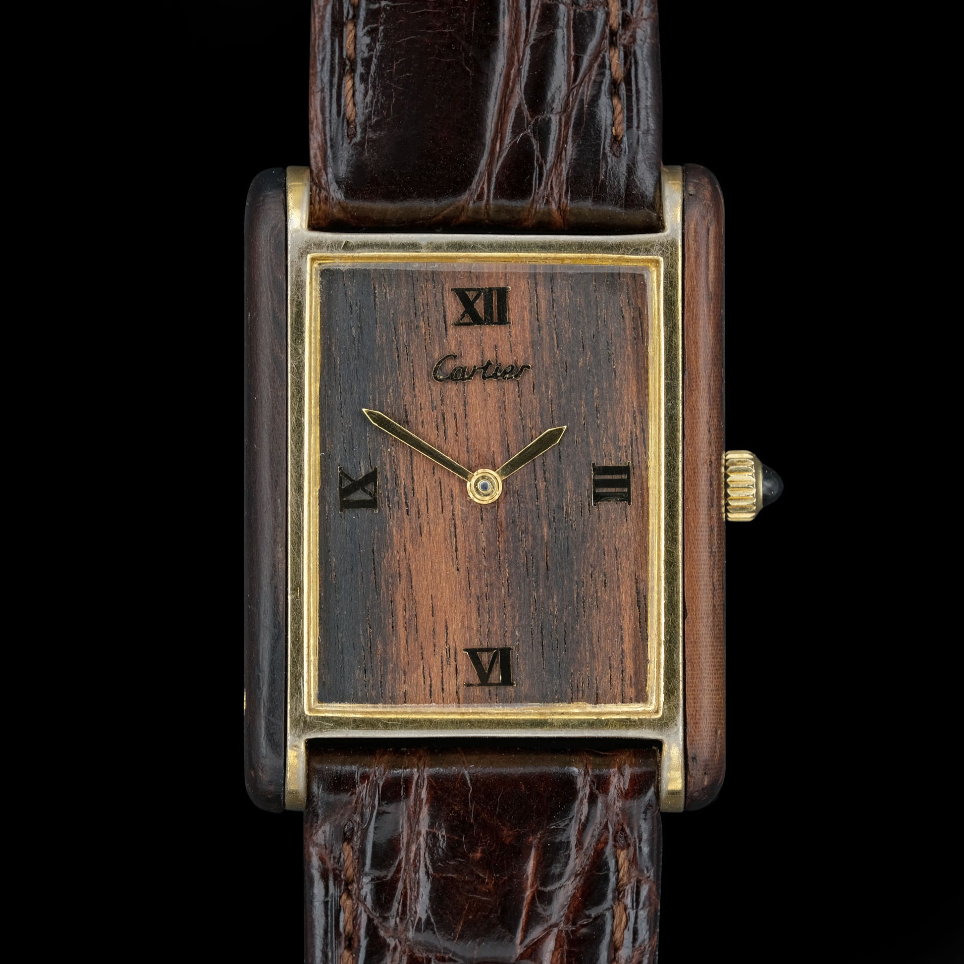 Cartier created the "pre-Must'' Cartier Tank Organic watches in the mid-'70s, with two versions: refs. 20611 (medium) and 21611 (jumbo). These watches were crafted in a rare Brazilian rosewood called Palissandre De Rio, featuring wooden side panels and a matching-grained wood dial. The timepieces had a yellow gold-plated case, gold Roman numeral hour markers, and gold epée hands.