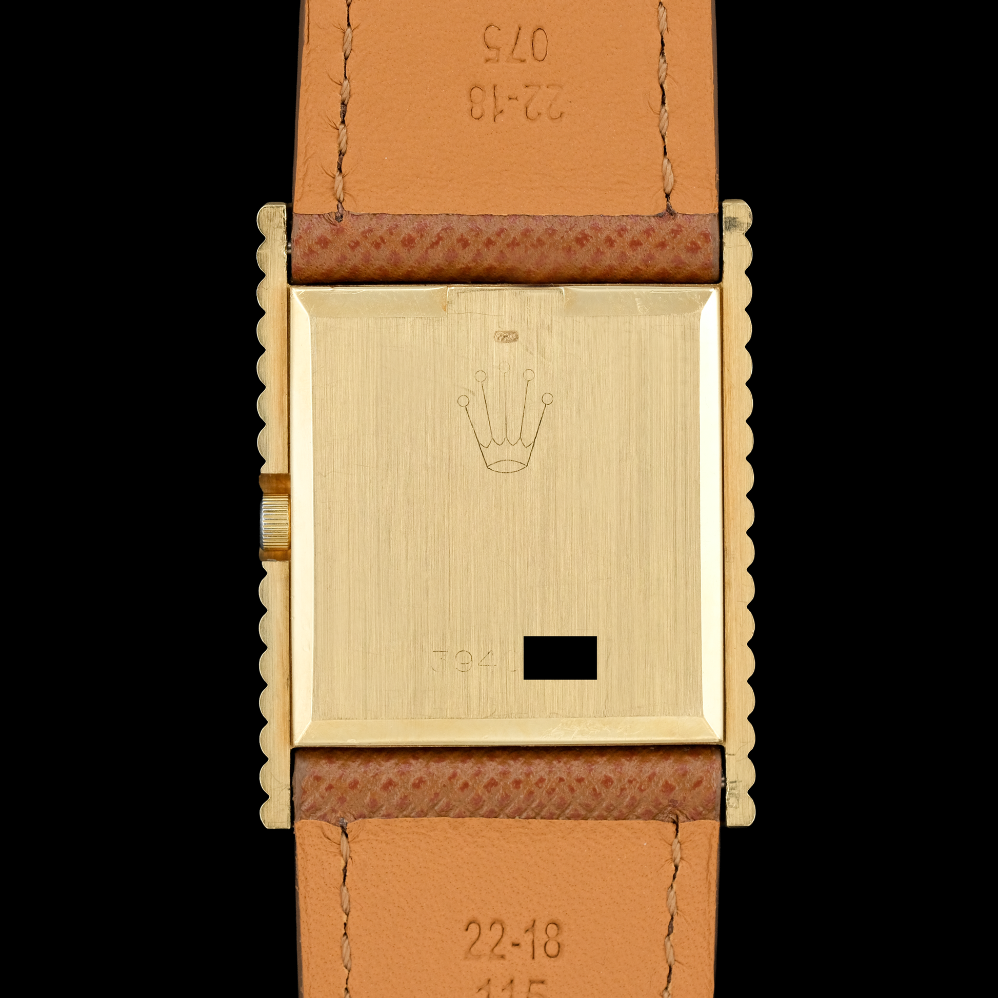 This watch features a beautiful orange/red "terracota" dial and a 18kt yellow gold rectangular case with horizontal ribbing that measures 32mm x 25mm, the ref. 4012 is an unusual timepiece given Rolex’s typically reserved design language. Featuring a metallic finish dial in blue, this particular example lacks any hour markers or dial furniture that could be used to tell the time besides its applied Rolex coronet at 12 o’clock. Powered by a manual-wind cal. 1600 movement and wearing like a larger variant of the Cartier Tank, but with some unique features like its ribbed construction and metallic dial, the ref. 4012 is an unsung hero within the Cellini collection.