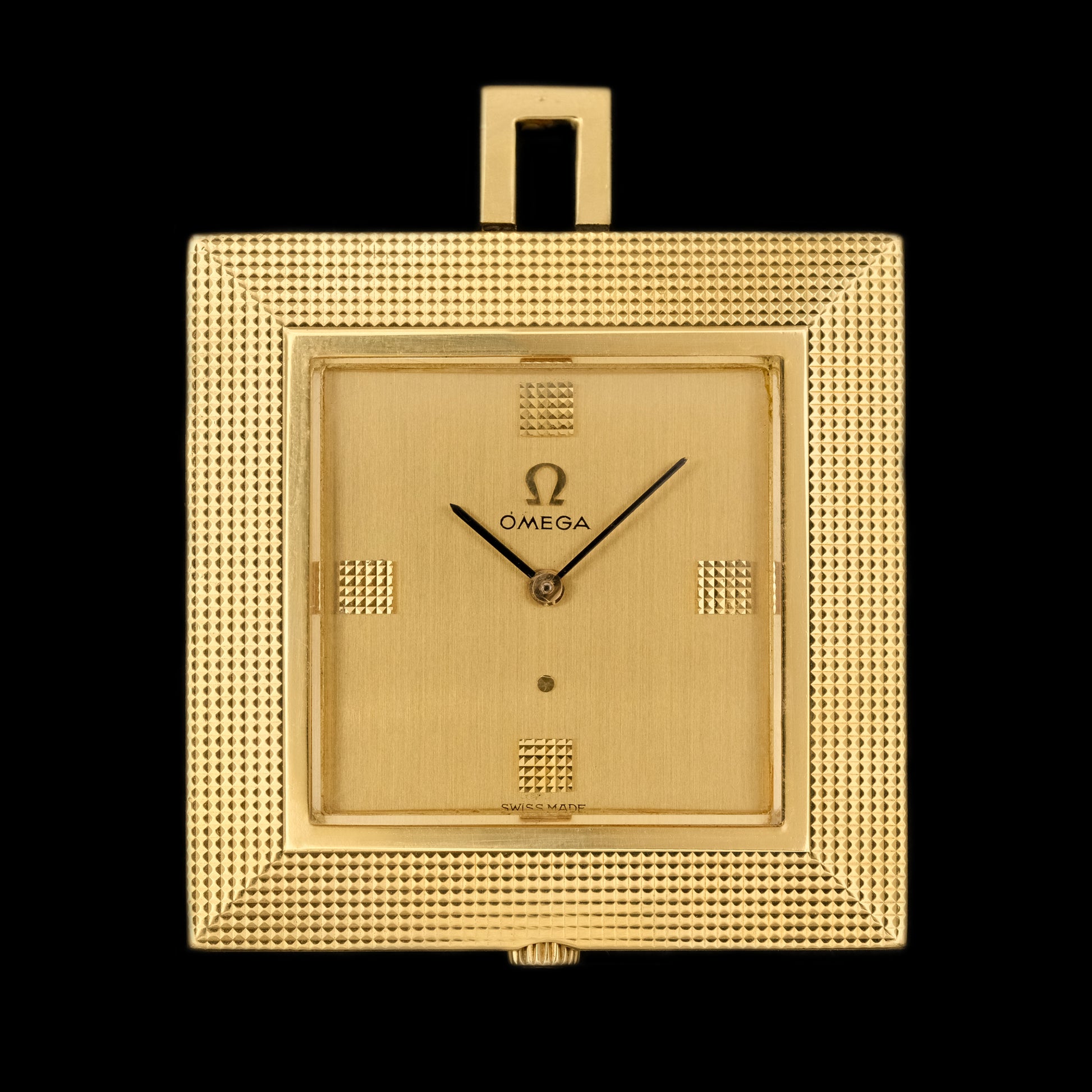 The Omega Square Pocket Watch Ref. 1715 is mid-century elegance with a twist, wear it around your neck. Crafted in yellow gold and measuring a sleek 34 mm, it breaks away from the ordinary with a bold square case that instantly stands out against the sea of round pocket watches.