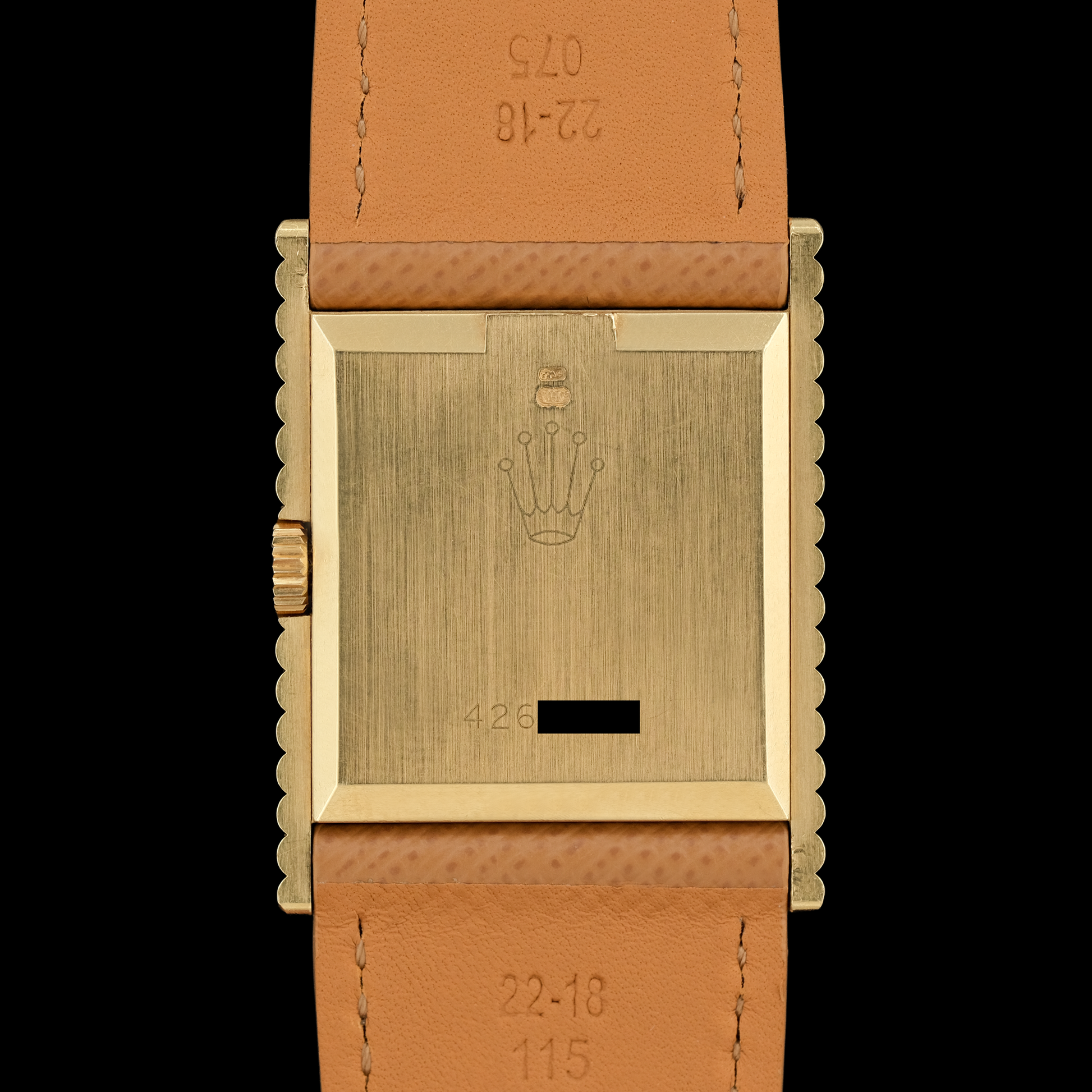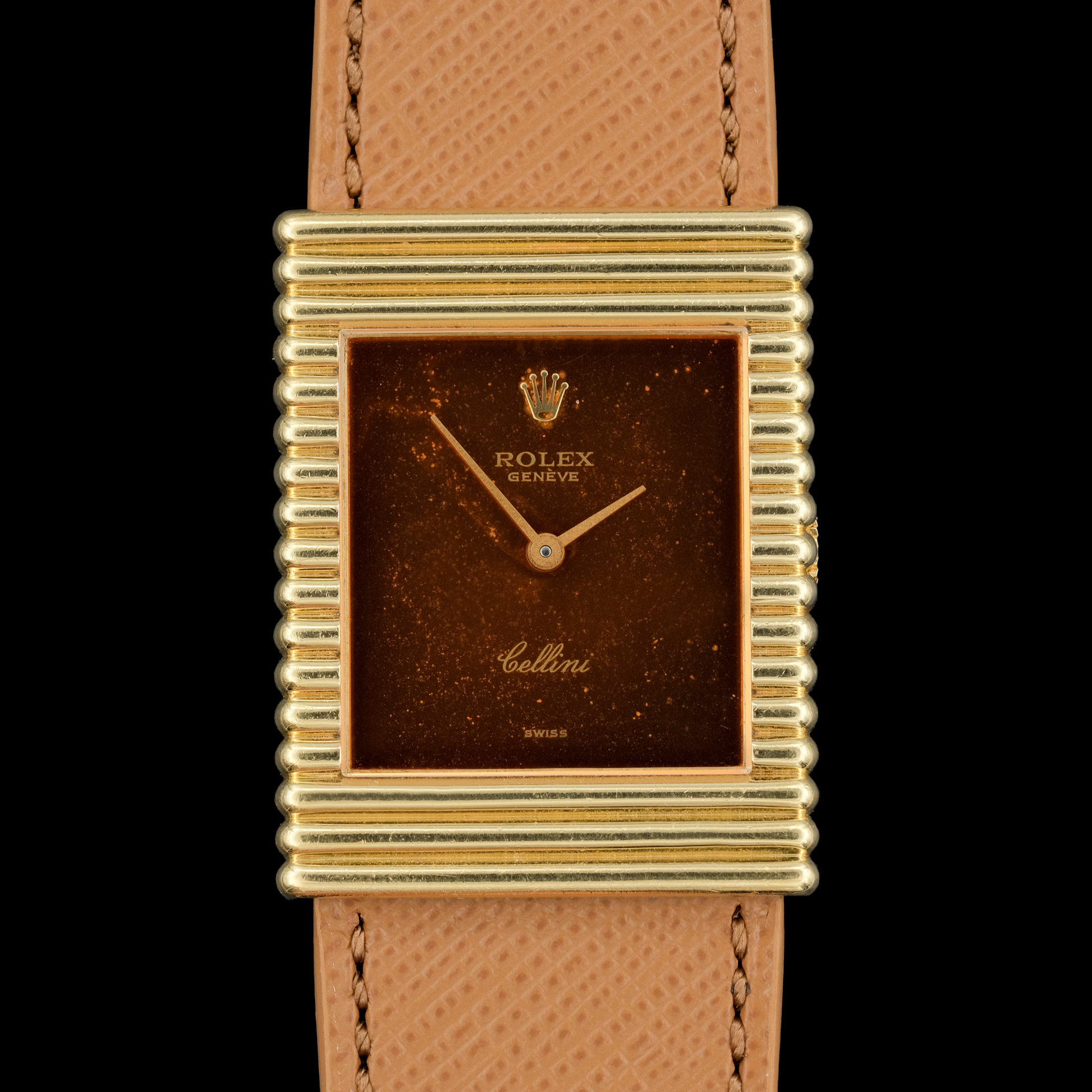 This watch features a beautiful orange/red "terracota" dial and a 18kt yellow gold rectangular case with horizontal ribbing that measures 32mm x 25mm, the ref. 4012 is an unusual timepiece given Rolex’s typically reserved design language. Featuring a metallic finish dial in blue, this particular example lacks any hour markers or dial furniture that could be used to tell the time besides its applied Rolex coronet at 12 o’clock. Powered by a manual-wind cal. 1600 movement and wearing like a larger variant of the Cartier Tank, but with some unique features like its ribbed construction and metallic dial, the ref. 4012 is an unsung hero within the Cellini collection.